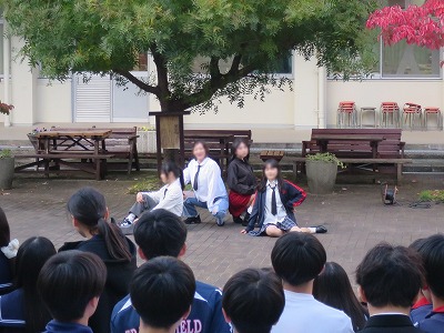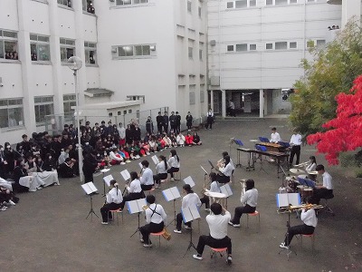 11月7日から12日の放課後、中庭でたそがれコンサートを開催しました。邦楽部、音楽部、ダンス部、演劇部、吹奏楽部、バトン部がそれぞれ発表を行いました。日頃の練習の成果を十分に発揮し、中庭に集まった多くの生徒や保護者を感動させる素晴らしいパフォーマンスを披露してくれ、大きな拍手とともに各クラブのパフォーマンスを楽しみました。