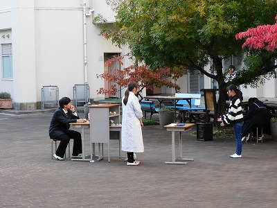 4月23日(水)の新入生歓迎コンサートにて、演劇部は荒唐無稽な依頼をめぐる探偵事務所を舞台にしたコメディー劇を上演しました。当日は天候が心配されましたが雨も上がり、演者の熱演や小道具を駆使した演出により、観客から笑いが起こり、多くの生徒に楽しんでもらうことができました。