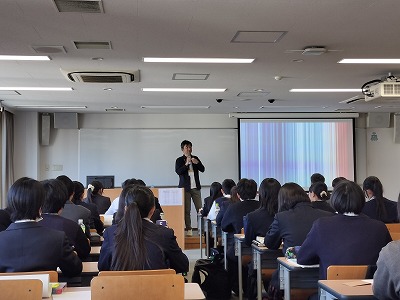 6月20日(金)、2年生を対象に、株式会社スマイリーアースの奥龍将さんによる講演会「世界が注目する小さなタオル会社―スマイリーアース」が行われました。講演は生徒との対談形式で進められ、奥さんの気さくな人柄もあり、会場は終始和やかな雰囲気に包まれていました。 常に課題意識を持ち、解決に向けて真剣に取り組んでこられた奥さんの言葉には説得力があり、生徒たちは探究活動へのヒントを得ると同時に、自分たちのこれからの生き方について考える貴重な機会となりました。
